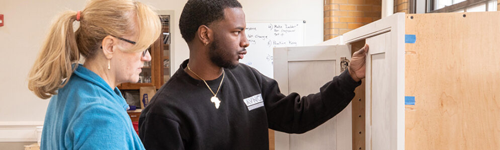 The cabinet class will cover the planning, designing, building, and installation of standard kitchen inset-style cabinets. This course will provide the understanding needed to build various other types of cabinets. Students will break down and mill the plywood needed to assemble the cabinet boxes. Using pre-milled stock, students will assemble the face frame and doors and install door and drawer hardware for these lower cabinets before scribing and installation.