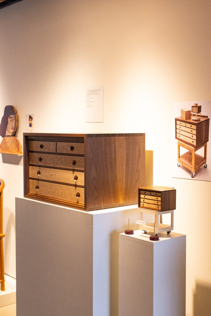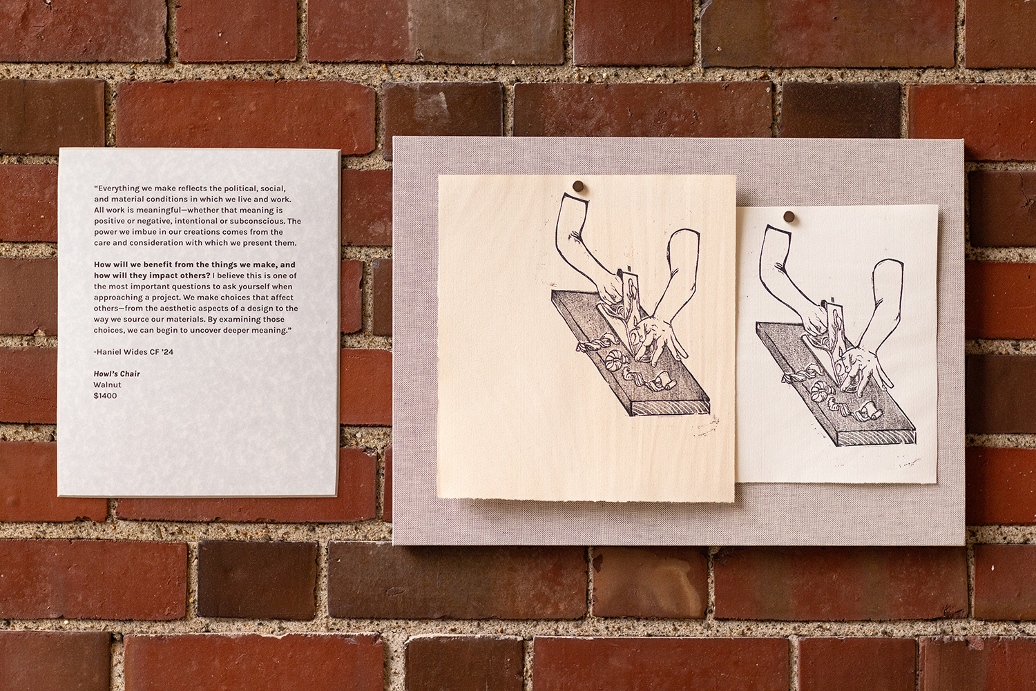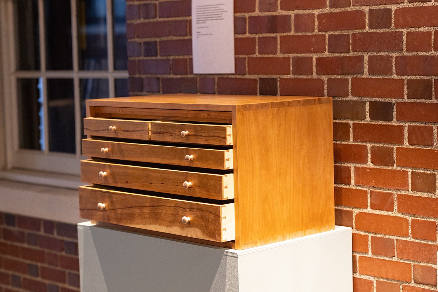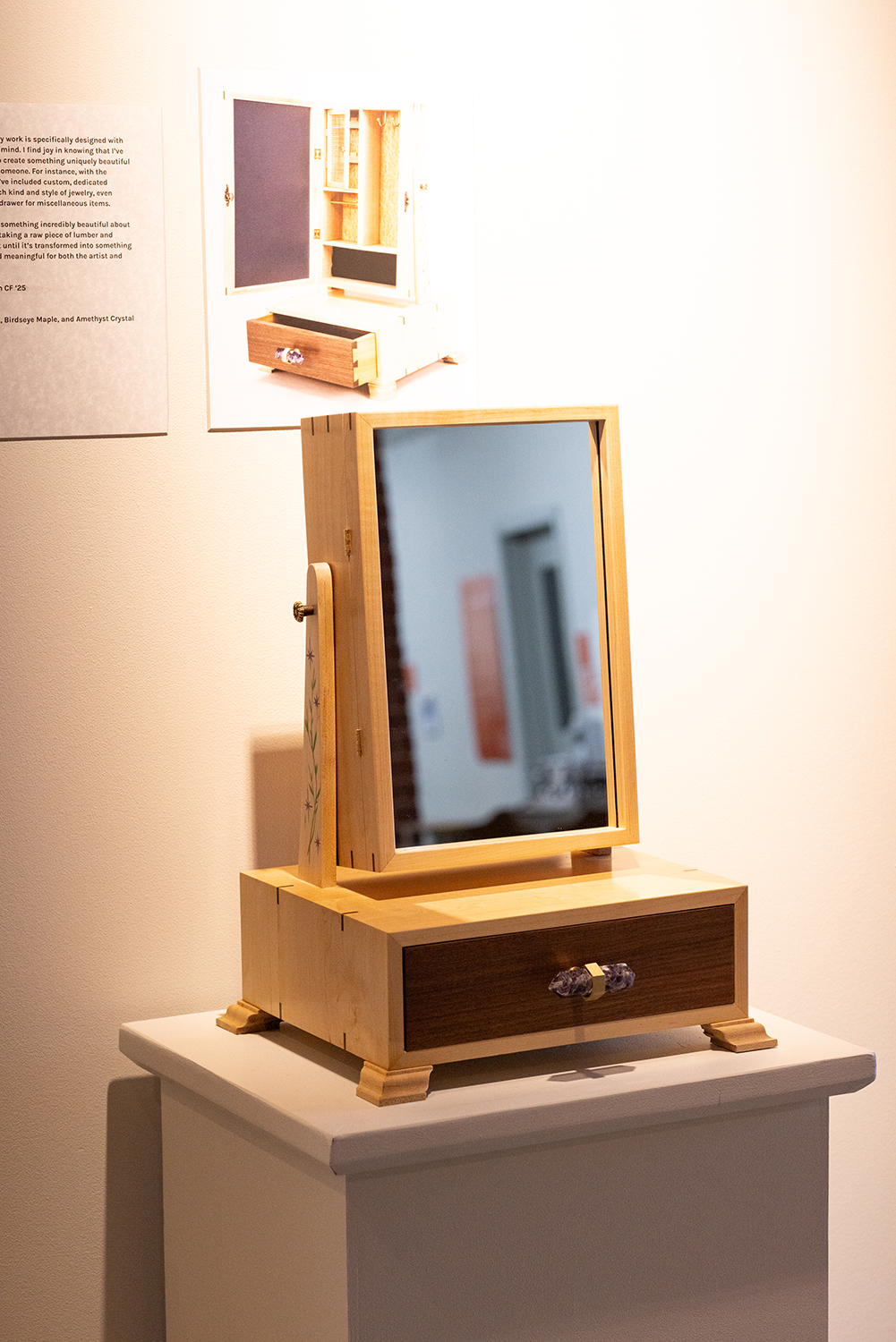 Exhibition Intro signPair of octagonal tables Alana Schwartz CF ’25Preservation models by Alex Schmidt PC ’23Pennsylvania Spice Box by Charlie Kline CF ’05Chairs by Caroline Knight CF ‘25, Matt Romick CF ’25, Alana Schwartz CF ’25, and Haniel Wides CF ’24Blanket chest and Rohlf’s Table by John Heveran CF ’25Rocket Box by Ainsley Donaldson CF ’79Mitered nightstand by Ellen Kaspern CF ’03Wooden boards coptic bound notebooks by Alex Begin CF ’23 and Ariana Rutledge BB ’22Windswept Tourmaline Ring by Geraldine Kish Perry JM ’00Monument Valley pendant by Karen Chartier JM ’03“Even Bohan” by Kalonymus ben Kalonymus, 13th century poet, bound by Elizabeth McHugh BB ’19Rocket Box by Ainsley Donaldson CF ’79Viewing the Locksmithing security camera displayClub chair by Maura Alverson CF ’25Bookbinder’s finishing press by Bob Miller CF ’11 and Yearbook reback by Carmen Torrado Gonzalez BB ’26Mushroom box by Lily Tilton CF ’23Star inlay table by Philip Lyon CF ’12Pair of octagonal tables Alana Schwartz CF ’25Art deco casepiece by Christine Ortiz CF ’24Wooden Globe by Juan Pablo Blanco CF ’12Drawings by Haniel Wides CF ’24Sterling hinge bracelet by Riley Freitas JM ’25Singapore chain necklace with garnet pendant and Garnet ring by Gigi Sui JM ’25Octagon pendant by Karen Chartier JM ’03Brass hairpin inspired by historic NBSS design by Isabelle Jensen JM ’26Stradivari model violin and Guarneri model viola by Edler Augustin VM ’25“Adam’s Adventures in the Army” bound by Johnny Carrera BB ’04“Embody / In Body, edition of 3” and “You Are Here, edition of 10” by Wendy Withrow BB ’08Notebook by Carmen Torrado Gonzalez BB ’26 (left) and “Marion Harland’s Complete Cook Book” reback repair and clamshell box (right) by Willa Anderson BB ’26Trio of sewing samples by Rachel Payne BB ’23Book, “Poetical Vagaries of the Knight of the Folding Stick” bound by Stephanie Sieverding BB ’25Book, “Poetical Vagaries of the Knight of the Folding Stick” bound by Suehade Soto BB ’25Book, “Poetical Vagaries of the Knight of the Folding Stick” bound by Laura Kraegel BB ’25Book, “Poetical Vagaries of the Knight of the Folding Stick” bound by Ash Nunez BB ’25Twisted wire ring (left) by Jasmine Barros JM ’26, and Forged gold hoops and Forged gold ring (right) by Isabelle Schmit JM ’26Live edge stool set and book, “Thomas J. MacDonald, Furniture Maker,” by Tommy MacDonald CF ’01Upholstered rocking chair by Tommy MacDonald CF ’01Blanket chest by Rob Solomon CF ’25Toolbox and mini toolbox by Zach Reynolds CF ’26Toolbox by Sarah Moreno CF ’26Custom guitar by Justin Garnache CF ’23Jewelry stand by Dee Cohen CF ’25Roundback chair and marquetry piece of Leonardo Da Vinci by Hugo Nakashima-Brown CF ’24“Rag + Pulp” bound by Jennifer Pellecchia BB ’19“Notions” bound by Willa Anderson BB ’26 (right) and by Mimi Zycherman BB ’23 (left)