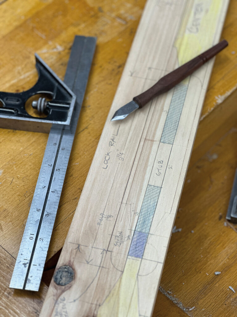 One of the real “aha” moments in the PC1 program is the Story Stick. It’s a simple-looking tool, but students knife in razor-fine, precise locations for mortises and tenon shoulders. Up to this point, they’ve relied on drawings, tape measures, and rulers. But the Story Stick represents a shift—building to the edge of a razor rather than to a number on a tape. This mid-year project changes how they think about accuracy, and for many, it’s the moment they really see what precision carpentry is all about.