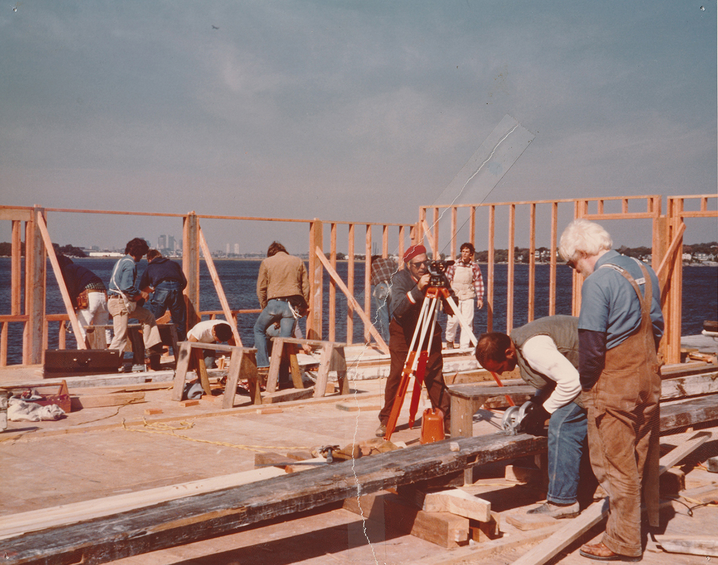 In examining the archival images of the yacht club rebuild underway, Peter is struck by the challenges of the location jutting out over the ocean (and also some of the looser safety regulations on display that were just a product of the time): “This was a very exposed job site. Part of teaching is doing it in all conditions, though. (Within safety guidelines, of course.) And it’s about students understanding that the project they’re working on is going to be around for a long time—just like this yacht club. What I see in this story is a rediscovery of the built legacy of NBSS.”