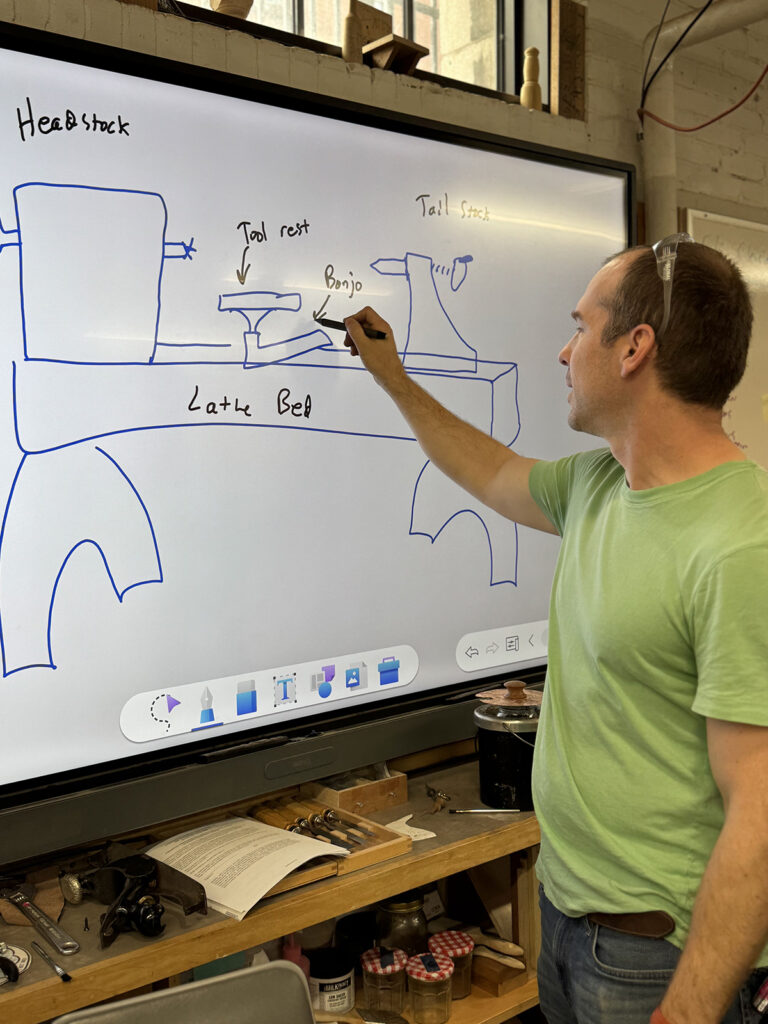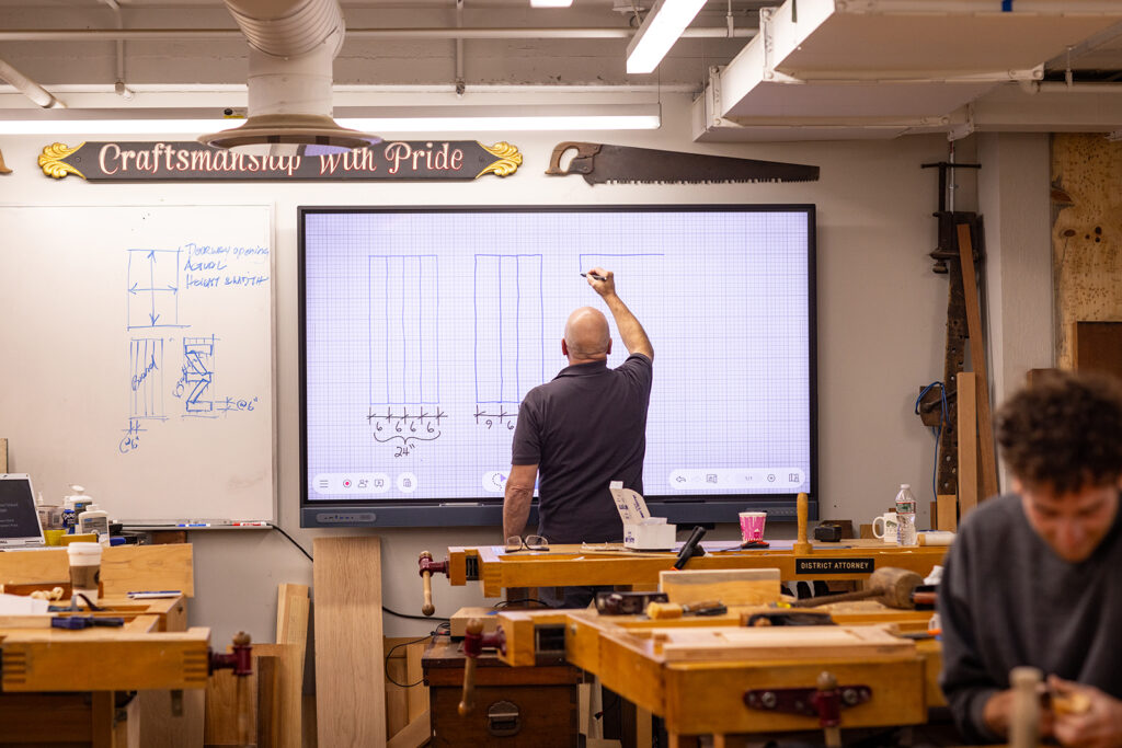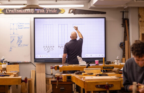 “It’s just my dream whiteboard,” says Eli Cleveland CF ’09, Three-Month Furniture Making Intensive Instructor, who was thrilled when a smart board arrived for the Community Education (CE) bench room. Before that, Eli took notes on a piece of plexiglass fashioned over a standard TV monitor.