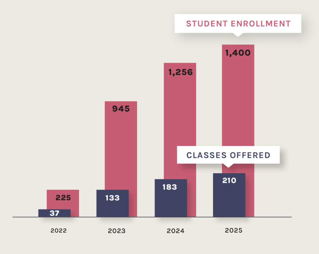 After a complete pause in 2020 and 2021, CE cautiously resumed in 2022 with just 37 classes and 225 students—well short of pre-pandemic levels. But the rebound came quickly. In 2023, the School offered 133 classes to 945 students. In 2024, that number jumped to 183 classes and 1,256 students. Now in 2025, CE is on track to serve over 1,400 students across 210 classes—a record on all fronts.